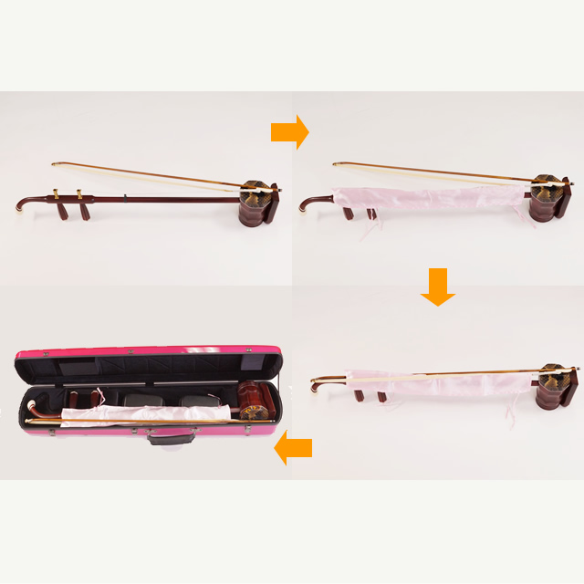 二胡の弦や棹に弓の松脂が付着するのを防ぐ弦カバー。スタンドに立てる際やケースに収納する際、練習始めや終了時に気分が華やぐ明るいカラー、布地のやさしい色合いが二胡本体の色をよりひきたつ、長く使っても飽きが来ない可愛らしいアクセサリとしてもオススメいたします!ピンク・ブルー・シルバー・イエロー・の4色からお選びください。サイズ8×58cm 材質はポリエステル100%
